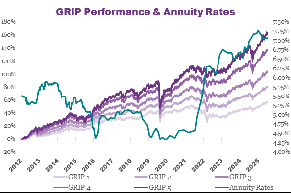 The graph below highlights how average annuity rates have varied in relation to the performance of the GRIPs since launch. This relationship is important as it can directly impact a customer’s income sustainability, depending on their investment target*: